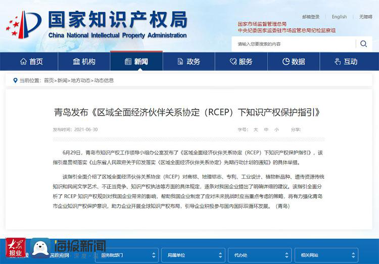 近日,青岛市知识产权工作领导小组办公室发布了《区域全面经济伙伴关系协定(RCEP)下知识产权保护指引》(以下简称《指引》),贯彻落实《山东省人民政府关于印发落实〈区域全面经济伙伴关系协定〉先期行动计划的通知》的具体举措。