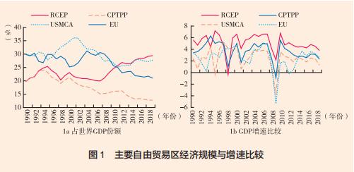 根据世界银行的统计,《美国-墨西哥-加拿大协定》(The United States-Mexico-Canada Agreement,USMCA)曾是世界上GDP份额最大的自由贸易区,2002年占世界GDP的近36%,近年来有所下滑;欧盟(EU)整体上也呈下降趋势。RCEP国家占世界GDP的份额在2008年金融危机后明显提升,2012年超过美墨加地区成为世界上经济规模最大的区域。2019年RCEP国家的GDP总额约为26万亿美元,占世界经济总量的29.43%(见图1a)。另外,RCEP国家已经成为拉动全球经济增长的新兴力量。21世纪以来,RCEP国家GDP平均增速高出USMCA、EU和CPTPP区域1~2个百分点(见图1b)。同时,RCEP也是覆盖人口最多的自由贸易区,劳动力资源丰富。2019年RCEP地区人口达到22.67亿人,占世界人口的29.54%,是USMCA、EU和CPTPP人口的4.4~4.6倍。