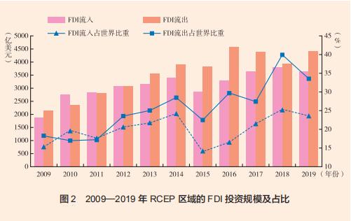 在投资方面,近年来,尽管国际投资整体低迷,但RCEP区域却表现出良好的增长势头。一方面,RCEP国家已经成为世界FDI的主要目的地。2010—2019年,RCEP区域吸引的FDI流入从2753.18亿美元增加至3636.52亿美元,占全球FDI总额的比重从19.72% 上升至23.62%,即全球约有1/4的国际资本流入RCEP地区(见图2)。其中,中国、新加坡、澳大利亚等是主要目的地,2019年国际资本流入占比分别为38.84%、25.32%、9.94%。另一方面,RCEP国家也成为越来越重要的投资来源国。对外直接投资规模从2010年的2371.2亿美元增加至2019年的4409.2亿美元,所占世界份额从16.99% 快速提高至33.56%,即全球约有1/3的国际资本来自RCEP地区(见图2)。相比于欧盟、美墨加等自由贸易区,RCEP区域内部的资本流动仍较为有限。2020年 ,流向RCEP的外资中70% 来自区域之外的国家。目前,区域内的主要投资来源国有中国、日本、韩国和新加坡(UNCTAD,2020)。2019年中国对RCEP区域的直接投资流量为164亿美元,约占全部对外直接投资的12%;直接投资存量为2.2万亿美元,占OFDI存量规模的7% 左右。