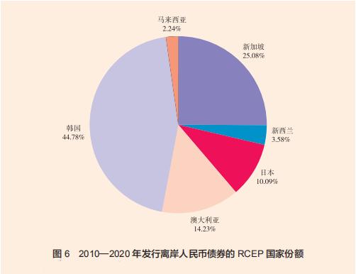RCEP地区离岸人民币市场的金融产品逐渐丰富。2015年10月,韩国交易所开始推出人民币期货产品;2019年,新加坡交易所的美元兑离岸人民币期货产品成交额超过9070亿美元,较2018年增长76%。WIND离岸债券市场数据显示,2010—2020年,离岸人民币债券(“点心债”)累计发行规模超过2万亿元,发行主体以中国政府、金融机构和中资企业为主。其中,RCEP国家累计发行离岸人民币债券152支,金额达到936.26亿元,占点心债总额的比重仍较低。RCEP国家发行离岸人民币债券最主要的上市地点为新加坡,累计发行金额占比达到30%;其次为中国台湾(28.47%) 、法兰克福(24.35%)和中国香港(14.79%)。从发行主体的来源国来看,韩国发行的离岸人民币债券占据主导,累计金额占比达到44.78%,其次为新加坡(25.08%)、澳大利亚(14.23%)和日本(10.09%),具体见图6。