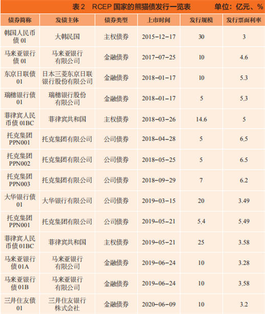 其次,投融资金融产品多元化。RCEP国家不仅积极参与投资股票、债券等人民币金融产品,也可以发行以人民币计价的熊猫债券。根据WIND数据库,截至2020年,外国政府、金融机构、非金融企业以及国际开发机构等已在中国银行间市场和交易所市场累计发行“熊猫债”254支,发行金额4303.2亿元。其中,RCEP国家发行14支,金额达到167亿元(见表2)。发债主体包括韩国政府、菲律宾政府、日本和新加坡金融机构等,主权债券、金融债券和公司债券的发行金额占比分别为41.68%、32.93%和25.39%。除此以外,世界银行、国际金融公司、亚行等国际开发机构也积极发行以人民币计价的熊猫债。2020年6月,亚投行发行总额30亿元的熊猫债用于疫情防控。