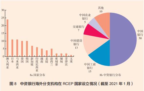 RCEP 国家支持人民币业务的金融机构网络建设良好。目前,中国已在全球25个国家和地区设立27家人民币清算行,其中8家设在RCEP国家。东盟国家中新加坡、泰国、马来西亚、菲律宾设有人民币清算行,此外还有韩国、澳大利亚各1家、日本两家人民币清算行。A 对各商业银行官网的数据统计发现,截至2021年1月,至少已有10家中资银行在RCEP范围内的15个国家设立100家分支机构,包括82家分行、13家子行以及5个代表处,基本实现对RCEP国家人民币业务的全覆盖。从地理分布来看,RCEP国家中澳大利亚拥有的中资银行分支机构最多,达到23家,其次为日本(11家)、马来西亚(11家)和泰国(10家)、韩国(10家);相比之下,菲律宾、缅甸、柬埔寨、文莱的人民币金融基础设施建设较为薄弱,仅有1~ 2家中资银行分布(见图8a)。从“走出去”的金融机构来看,RCEP国家是中资银行“走出去”的首选目的地和重要服务对象。中国银行是目前国际化程度最高的中资银行,RCEP国家中半数的分支机构来自中国银行,其次为中国工商银行(15家)和中国建设银行(12家)(见图8b)。