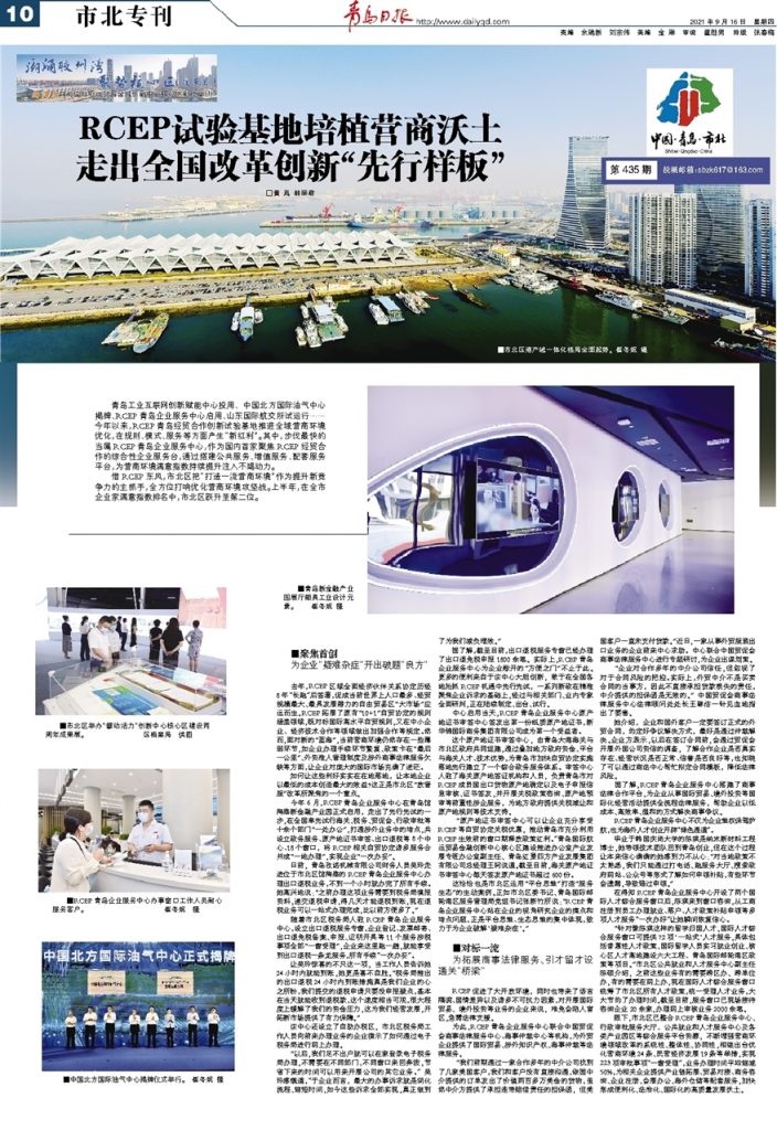 青岛工业互联网创新赋能中心投用、中国北方国际油气中心揭牌、RCEP青岛企业服务中心启用、山东国际航交所试运行……今年以来,RCEP青岛经贸合作创新试验基地推进全域营商环境优化,在规则、模式、服务等方面产生“新红利”。其中,步伐最快的当属RCEP青岛企业服务中心,作为国内首家聚焦RCEP经贸合作的综合性企业服务台,通过搭建公共服务、增值服务、配套服务平台,为营商环境满意指数持续提升注入不竭动力。