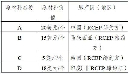 例如,中国生产的称重机X(FOB价58美元/个), X的原产地标准为“区域价值成分40%或品目改变”。所使用的原料如下: