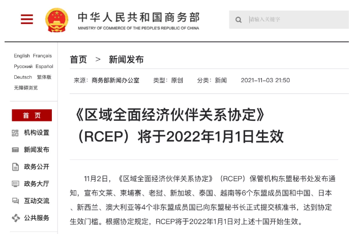 11月3日晚间,商务部发布消息,称《区域全面经济伙伴关系协定》(RCEP)保管机构东盟秘书处发布通知,宣布文莱、柬埔寨、老挝、新加坡、泰国、越南等6个东盟成员国和中国、日本、新西兰、澳大利亚等4个非东盟成员国已向东盟秘书长正式提交核准书,达到协定生效门槛。根据协定规定,RCEP将于2022年1月1日对上述十国开始生效。