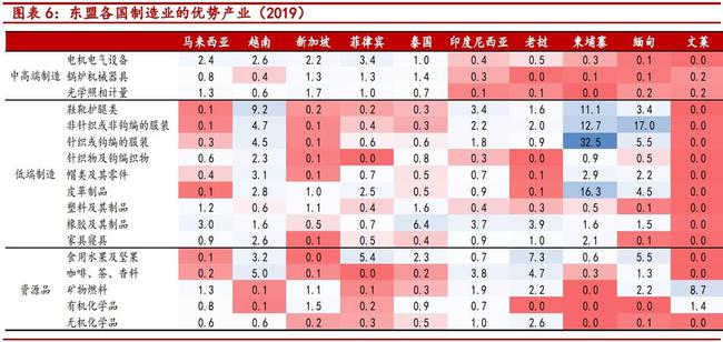 根据中泰证券的测算,新加坡、马来西亚、越南、菲律宾在中高端制造中具有一定比较优势,而印尼、老挝、缅甸、柬埔寨的竞争优势集中在中低端制造领域。