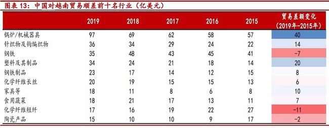 从贸易产品来看,我国与东盟之间竞争性主要体现在低端制造业领域。相反,在中高端制造的众多领域如机械器具、机电产品等是中国从东盟贸易顺差的重要来源,且这种优势在最近五年普遍被进一步放大。
