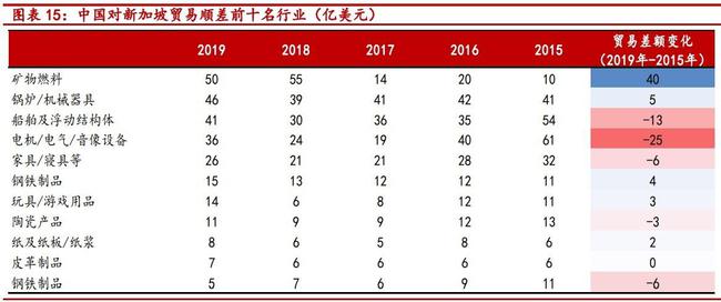 此外,新加波具有资金、技术优势,但资源匮乏,矿物燃料、机械器具、机电产品是中新贸易顺差的重要支撑。