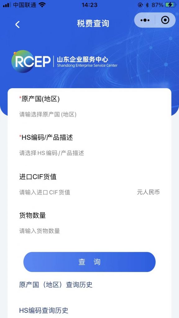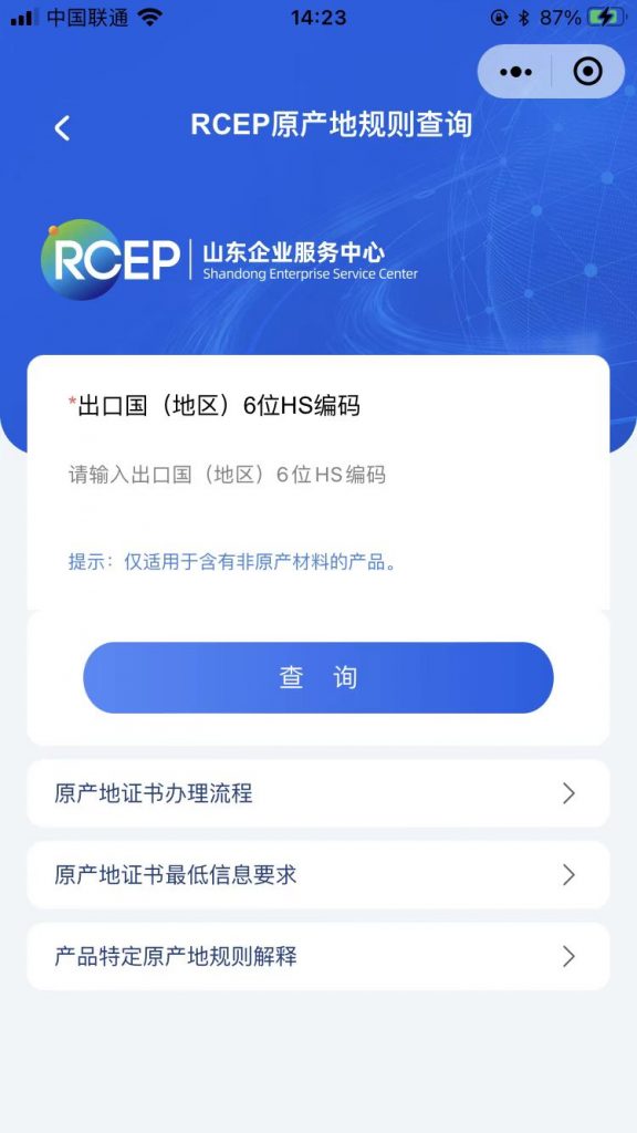 针对上述问题,RCEP山东企业服务中心在现有外贸实务查询平台的基础上,围绕RCEP协定特殊规则和信息要求,发挥RCEP框架下先行先试样板的作用,通过海关与税务数据资源有效整合,特此推出一款智能化、可视化程度高,功能完备,富有特色的查询系统——RCEP外贸实务查询小程序,并已于2022年1月1日正式上线。目前RCEP外贸实务查询系统主要实现税费查询、RCEP原产地规则查询以及RCEP原产国认定三大功能。