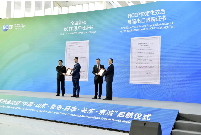 2022年1月1日,青岛海关签发全国首份RCEP原产地证书。凭借这份证书,青岛海湾集团有限公司出口氯化钙到日本后缴纳的关税税率可由3.3%降为3%,仅当日发走的一批2800余吨货物税款减免就达到近万元。预计RCEP生效首年,公司出口货物可在日本累计少缴关税约100万元,促进出口增长10%左右。