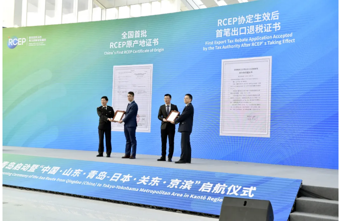 在1月1日的仪式现场,颁出了全国首份RCEP原产地证书以及RCEP协定生效后税务机关受理首笔出口退税申请。一系列具有里程碑意义成绩的取得,为青岛与RCEP成员国建立更加紧密的合作关系,推动更宽领域、更深层次的务实合作,夯实了基础。