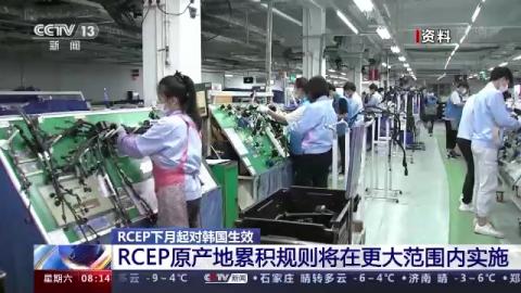 对外经济贸易大学国际经贸学院教授崔凡:由于RCEP的原产地(累积)规则,RCEP对韩国生效后,它在更大范围内实施累积,当企业使用到(原产于)韩国的中间产品的时候,那么这些中间产品也能够累积计算到区域的价值中间来,从而使他们更容易获得优惠的关税安排。