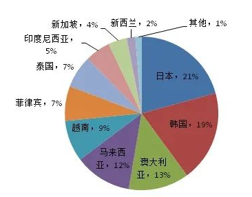 2021年,我国出口RCEP成员国玩具559.6亿元,约占我国出口玩具的18.8%。按单一国别计,我国玩具前十大出口市场中,RCEP成员占四位,分别为日本、韩国、澳大利亚和马来西亚,分别出口116.0亿元、107.4亿元、71.4亿元、67.5亿元,具体如下图所示。