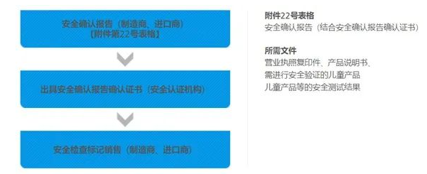 2.儿童产品制造商或进口商在发货或清关前,接受针对每种儿童产品型号指定的检测和检验机构的安全性检测和检查,确认符合儿童产品的安全标准后,向安全认证机构报告。