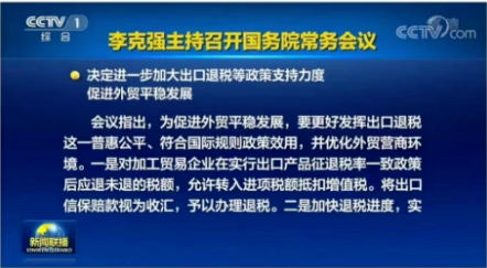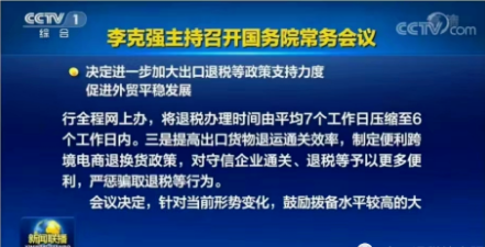 会议指出,为助力外贸企业缓解困难、促进进出口平稳发展,要更好发挥出口退税这一普惠公平、符合国际规则政策的效用,并从多方面优化外贸营商环境。一是对加工贸易企业在国家实行出口产品征退税率一致政策后应退未退的税额,允许转入进项税额抵扣增值税。将外贸企业取得的出口信保赔款视为收汇,予以办理退税。扩大离境退税政策覆盖范围,推行“即买即退”等便利措施。二是加快退税进度。强化部门数据共享,精简退税所需资料,做到申报、审核、反馈全程网上办,今年将正常退税办理时间由平均7个工作日进一步压缩至6个工作日内。支持外贸综合服务企业集中代办退税。三是持续优化外贸营商环境。提高出口货物退运通关效率。研究制定支持海外仓发展、便利跨境电商退换货的政策。对守信企业在通关、退税等方面予以更多便利,对虚假出口、骗取退税等行为依法严惩。