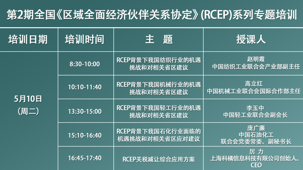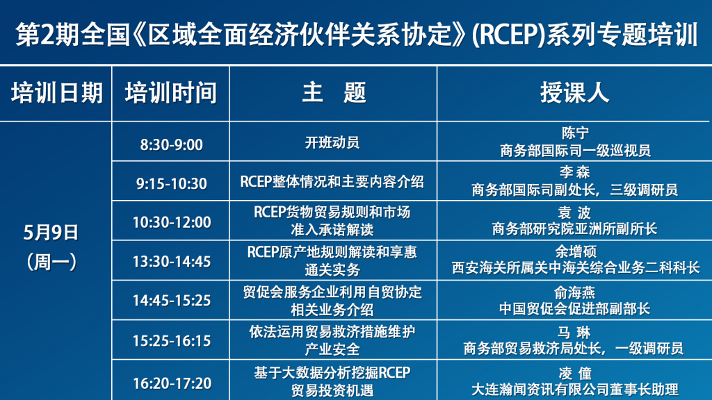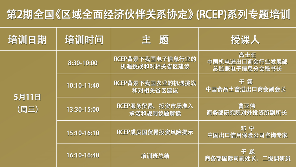 本期RCEP专题培训是商务部今年举办的全国RCEP系列专题培训之一,于5月9日(星期一)上午8:30正式开始,欢迎各位收看直播参与学习。培训面向企业免费开放,无需报名和签到,培训不设置回放,请大家珍惜学习机会现场听课。