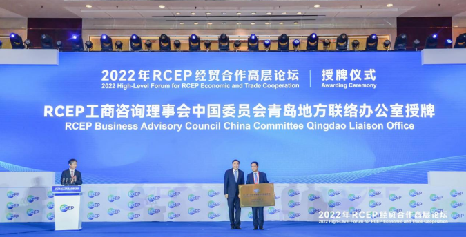 7月28日,2022年RCEP经贸合作高层论坛在青岛举行。论坛以“新机遇·新格局·新启航”为主题,RCEP成员国相关政府部门官员、驻华使领馆代表、贸易投资促进机构和商协会代表、经贸领域专家学者和企业家代表等相聚线上线下,共商合作,共谋发展。本次论坛由中国贸促会和山东省人民政府主办,中国国际商会和青岛市人民政府承办。论坛期间,发布了《全国贸促系统推动高质量实施区域全面经济伙伴关系协定行动宣言》;中国贸促会向RCEP工商咨询理事会中国委员会青岛地方联络办公室和委员会主席单位、副主席单位授牌;“RCEP鲁贸通”国际版正式上线。