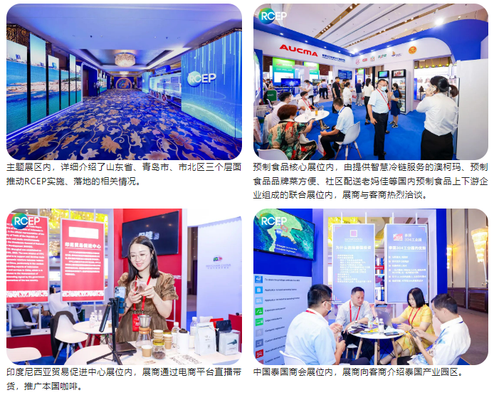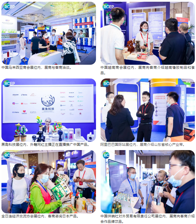 来自10个国家的60余家机构和企业进行了展示交流,包括中国越南商会、中国马来西亚商会、中国泰国商会、印度尼西亚贸易促进中心、日本西村朝日律所、RCEP山东企业服务中心、中国贸促会商法中心、中远海运、中国供销社对外贸易有限责任公司、国际航运保险运营服务中心、国美零售、澳柯玛冷链、奥昆食品、四季顺鑫、阿里巴巴国际站、天猫、速卖通、拉赞达、黑角科技等单位,内容涵盖经贸信息咨询、商事法律、金融保险、物流运输、预制食品、跨境电商等内容。