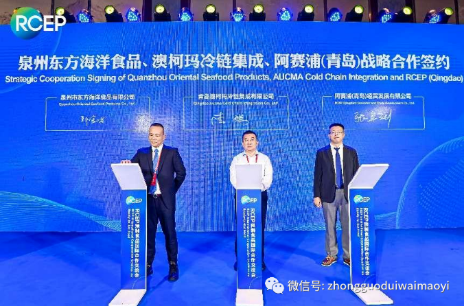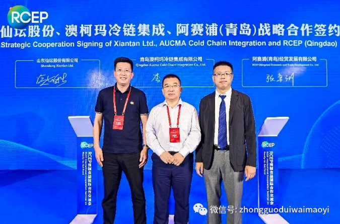 在签约环节,山东省贸促会与大韩贸易投资振兴公社青岛代表处签署了RCEP合作备忘录,青岛市贸促会与广西贸促会签署RCEP业务合作协议,青岛市贸促会、中国供销合作对外贸易有限责任公司与泰国馆集团有限公司签署合作备忘录。