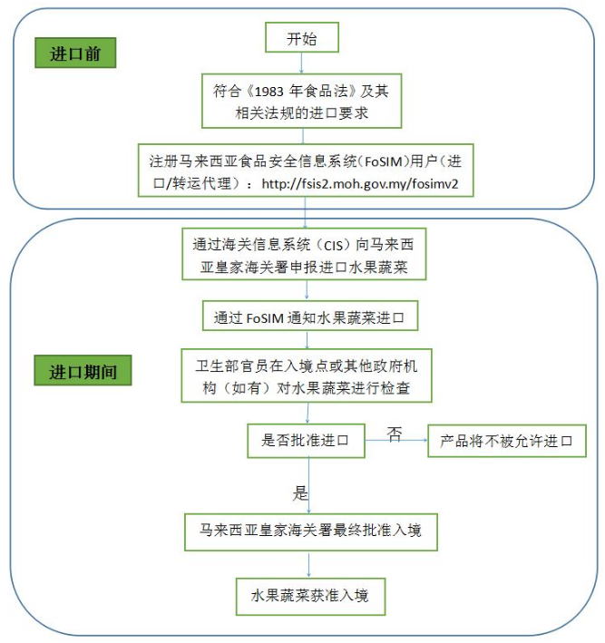 水果蔬菜进口管制由卫生部(MOH)、检疫检验局(MAQIS)和皇家海关署(KDRM)合作进行。进口水果蔬菜需要在马来西亚检验检疫局系统注册登记;进口商必须在水果蔬菜到马来西亚前至少一个月提交所需文件。文件检查和检验检疫将在马来西亚的机场和港口进行,具体进口程序如下图所示。