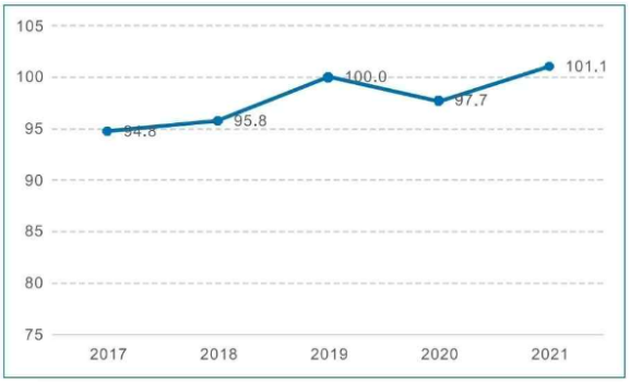 评价结果显示,2021年RCEP海运贸易指数为101.1,较上年度上升3.4点,已超过疫情前的最高水平(2019年)。可以看出,近年来RCEP海运贸易指数总体呈上升趋势,疫情等因素影响导致2020年RCEP海运贸易指数出现下滑。