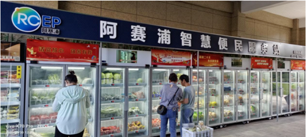 阿赛浦智慧便民服务站基于阿赛浦集采平台在区块链、人工智能、大数据等领域的技术优势,依托澳柯玛控温锁鲜技术,提供24小时精准控温保障。享受RCEP惠企红利,RCEP商品及预制菜产品以智慧数字科技的方式进入社区,让老百姓实实在在受益。