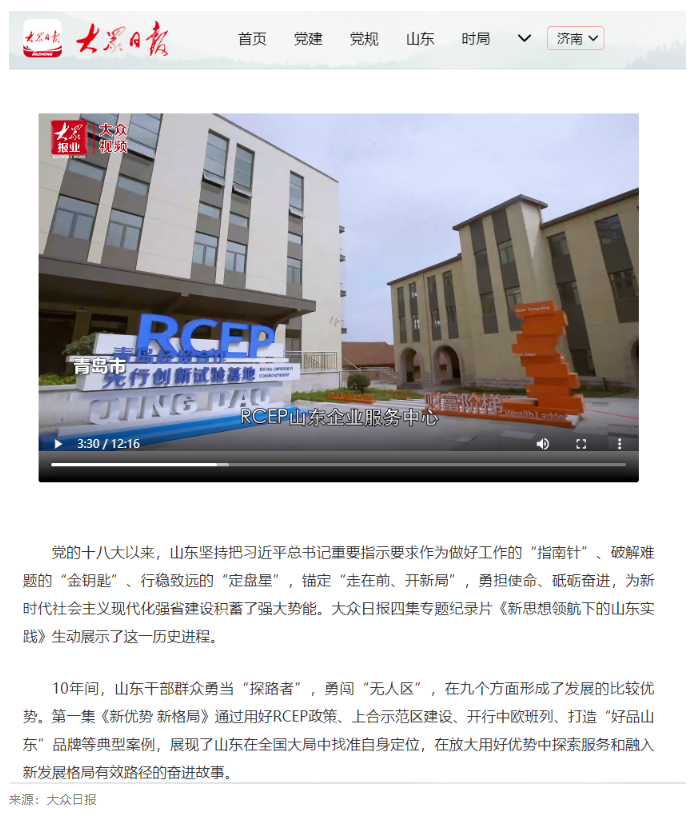 10月12日,《大众日报》推出专题纪录片《新思想领航下的山东实践》,宣传报道RCEP山东企业服务中心。