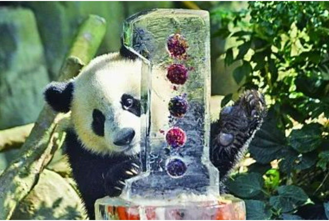 2022年8月12日,在新加坡河川生态园,大熊猫幼崽叻叻在自己一岁生日庆祝活动上品尝冰块蛋糕。新华社发