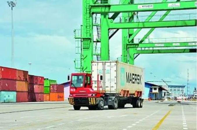2022年1月1日,车辆在文莱摩拉港码头运输集装箱。新华社发