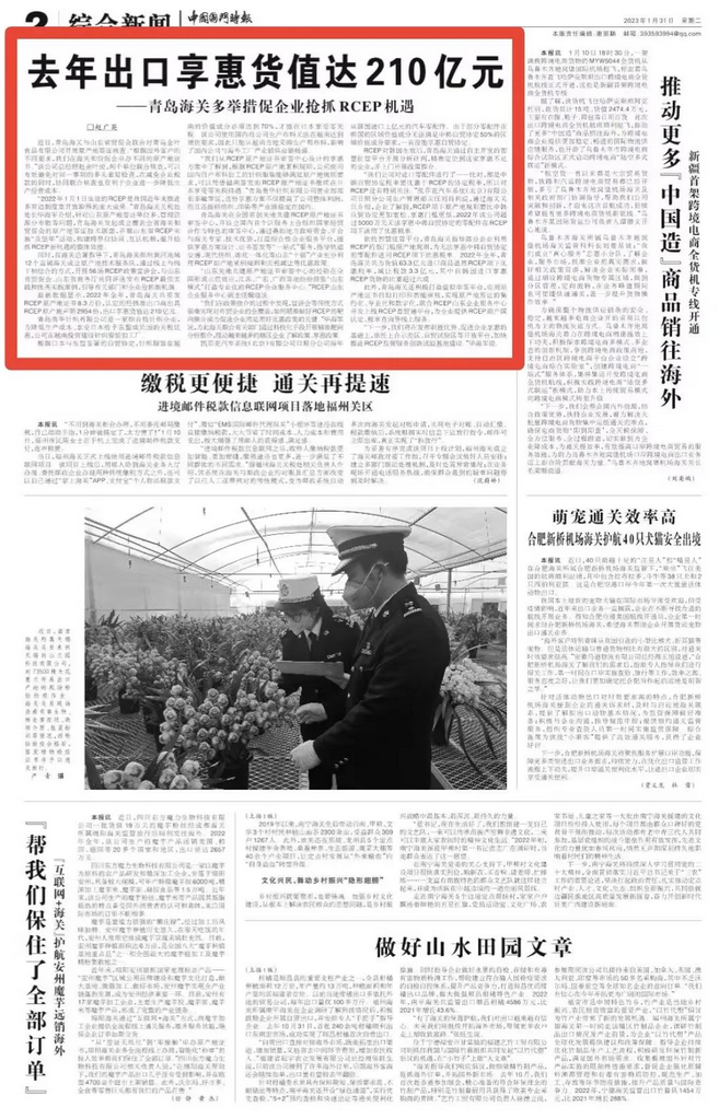同时,在海关总署指导下,青岛海关组织黄河流域12个直属海关成立原产地技术服务队,通过线上与线下相结合的方式,开展56场RCEP政策宣讲会,与山东省贸促会、山东省商务厅共同评选发布RCEP最佳实践和优秀实践案例,引导有关部门和企业抢抓新机遇。