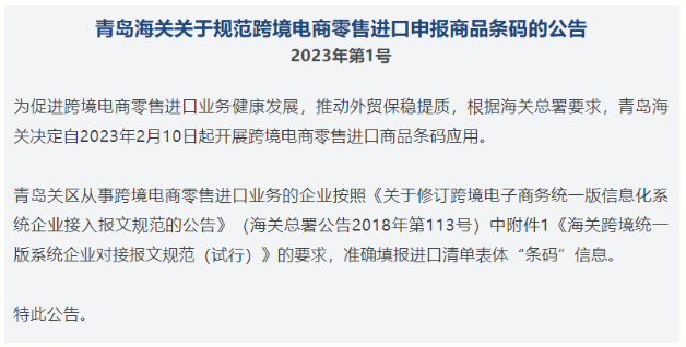为促进跨境电商零售进口业务健康发展,推动外贸保稳提质,自2023年2月10日起,全国海关开展跨境电商零售进口商品条码应用推广工作,青岛海关也同步下发《青岛海关关于规范跨境电商零售进口申报商品条码的公告》。