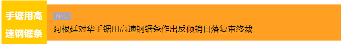 2023年3月23日,阿根廷经济部发布2023年第331号公告,对原产自中国的手锯用高速钢锯条(西班牙语:hojas de sierra manuales rectas de acero rápido)作出第二次反倾销日落复审肯定性终裁,维持阿根廷原生产部2017年第398号公告确定的0.46美元/个反倾销税不变,措施自公告发布之日起生效,有效期为5年。涉案产品的南共市海关编码为8202.91.00和8202.99.00。