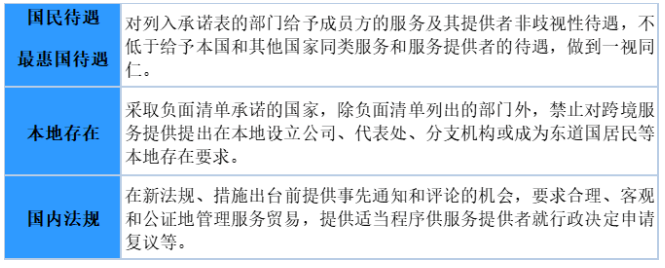 服务贸易的核心义务包括国民待遇、最惠国待遇、市场准入和本地存在。