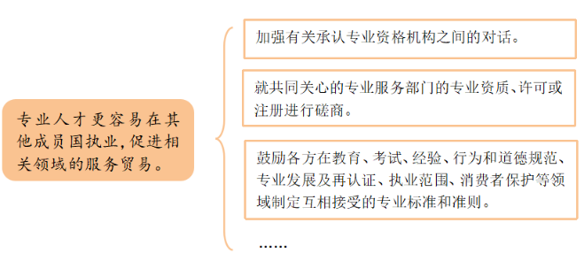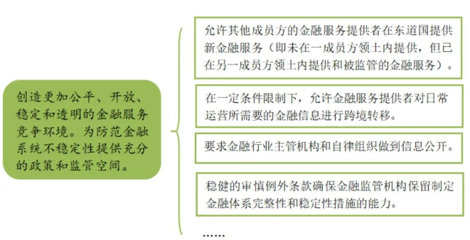服务贸易章节包括25个条款和金融服务、电信服务、专业服务3个附件,以及各成员在服务贸易领域的开放承诺。通过纳入国民待遇、最惠国待遇、市场准入、本地存在、国内法规条款等,消减限制性、歧视性措施,为扩大成员国相互间的服务贸易创造了条件。