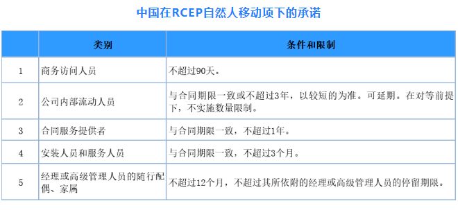 RCEP将从事货物贸易、提供服务或进行投资的自然人临时入境与临时停留所做承诺适用范围,扩展至服务提供者以外的投资者、随行配偶及家属等协定下所有可能跨境流动的自然人类别,总体水平均基本超过各成员在现有自贸协定缔约实践中的承诺水平。中国的承诺水平在15个成员国中属于高水平,东盟国家的承诺水平相对较低,作出承诺的人员类别较少。
