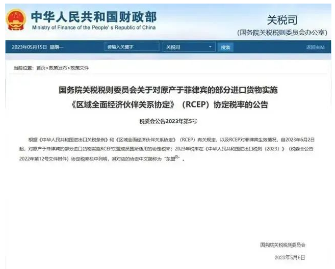 据财政部网站15日消息,根据《中华人民共和国进出口关税条例》和《区域全面经济伙伴关系协定》(RCEP)有关规定,以及RCEP对菲律宾生效情况,自2023年6月2日起,对原产于菲律宾的部分进口货物实施RCEP东盟成员国所适用的协定税率;2023年税率在《中华人民共和国进出口税则(2023)》(税委会公告2022年第12号文件附件)协定税率栏中列明,其对应的协定中文简称为“东盟R”。