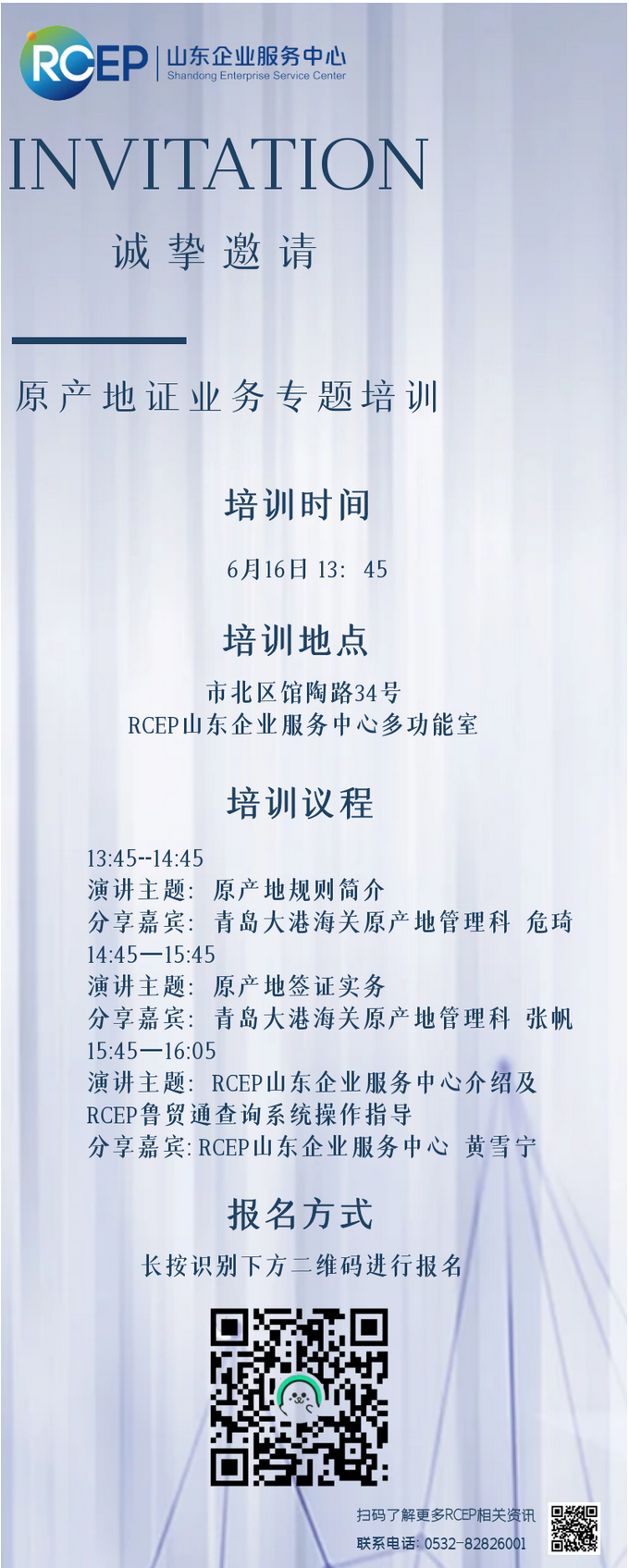 感谢您长久以来对RCEP山东企业服务中心的关注与支持,中心诚邀您参加原产地证业务主题培训,本次培训特别邀请青岛大港海关作原产地规则、原产地签证业务解读。期待您的到来!