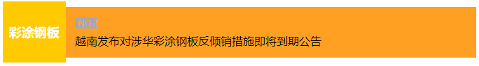 2023年7月26日,越南工贸部贸易防卫局发布公告称,对原产于中国和韩国彩涂钢板的反倾销税将于1年后到期,利益相关方应于公告发布30日内,即2023年8月25日(含)前提起日落复审调查申请。