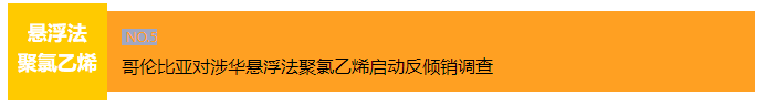 2023年7月19日,哥伦比亚贸工旅游部在官方日报发布2023年7月18日第142号公告称,应Mexichem Resinas Colombia S.A.S.申请,对原产于中国和美国的悬浮法聚氯乙烯(西班牙语:Cloruro de Polivinilo (PVC) tipo suspensión)启动反倾销调查。涉案产品的哥伦比亚税号为3904.10.20.00。本案倾销调查期为2022年5月10日至2023年5月9日。
