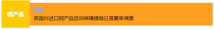 2023年9月4日,英国贸易救济署(TRA)发布公告,对进口钢产品(Certain Steel Products)启动保障措施日落复审调查。涉案产品包括非合金及其他合金热轧板和带材、非合金及其它合金冷轧板、金属涂层板、有机涂层板、镀锡板、非合金和其他合金四分板、合金商用钢筋和轻型型材、非合金商用钢筋及轻型型材、钢筋、非合金及其它合金线材、铁或非合金钢制角钢、型材和型材、铁路材料、煤气管、空心管、大型焊接管以及大型焊管其他焊接管等。