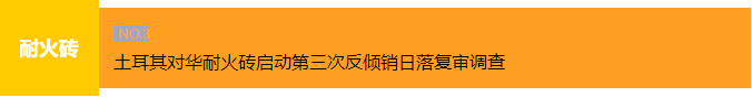 2023年9月2日,土耳其贸易部发布第2023/24号公告称,应土耳其国内生产商申请,对原产于中国的铬铁矿、菱镁矿和铬菱镁矿耐火砖(土耳其语:kromit ateş tuğlalar, magnezit ateş tuğlalar, krom magnezit ateş tuğlalar, magnezit, dolomit veya kromit içerenler (dolomit içerenler hariç; magnezyum oksit esaslı, 3 mm ile 30mm arası kalınlıklarda yapı levhaları hariç)启动第三次反倾销日落复审调查。本案涉及土耳其税号6902.10.00.10.11、6902.10.00.10.12、6902.10.00.10.13和6815.91项下的产品,但不包括厚度在3毫米至30毫米之间的氧化镁建筑板。公告自发布之日起生效,案件调查期间,现行反倾销税持续有效。