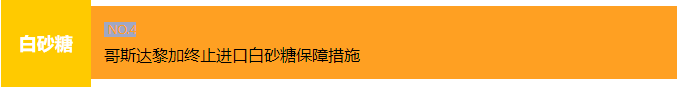 2023年9月5日,WTO保障措施委员会发布哥斯达黎加代表团于9月4日提交的保障措施通报。鉴于未接到对进口白砂糖保障措施的延期申请,哥斯达黎加决定自2023年8月19日起终止对进口白砂糖(西班牙语:Azúcar blanco y refino)实施保障措施。涉案产品包括家用及工业用的初级、特制及精炼白砂糖,涉及哥斯达黎加税号1701.99.00.00项下的产品。