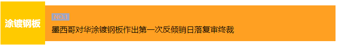 2023年9月13日,墨西哥经济部在官方公报发布公告,对原产于或进口自中国大陆和中国台湾地区的涂镀钢板(西班牙语:aceros planos recubiertos)作出第一次反倾销日落复审肯定性终裁,维持2017年6月5日作出的反倾销原审终裁措施不变,其中,中国大陆出口商宝山钢铁股份有限公司(Baoshan Iron & Steel Co. Ltd.)为22.22%、北京首钢冷轧薄板有限公司(Beijing Shougang Cold Rolling Co. Ltd.)、首钢京唐钢铁联合有限责任公司(Shougang Jingtang United Iron & Steel Co. Ltd.)、唐山钢铁集团有限责任公司(Tangshan Iron & Steel Group Co. Ltd.)均为22.26%,中国大陆其他出口商为76.33%;中国台湾地区出口商China Steel Corporation为22.26%、中国台湾地区其他出口商为52.57%。措施自2022年6月6日起生效,有效期为五年。