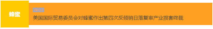 2023年9月14日,美国国际贸易委员会(ITC)投票对进口自中国的蜂蜜(Honey)作出第四次反倾销日落复审产业损害肯定性终裁:裁定若取消现行反倾销措施,在合理可预见期间内,涉案产品的进口对美国国内产业造成的实质性损害可能继续或再度发生。根据终裁结果,本案现行反倾销措施继续有效。在该项裁定中,5名美国国际贸易委员会委员均投肯定票。