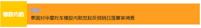 2023年11月14日,泰国倾销和补贴审查委员会发布公告称,对原产于中国的摩托车橡胶内胎(泰语:ยางในชนิดที่ใช้กับรถจักรยานยนต์,参考英语:Inner tubes of Rubber for Motorcycles)发起第二次反倾销日落复审调查。涉案产品的泰国海关编码为4013.90.20。公告自发布次日起生效。