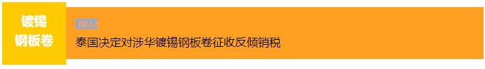 2023年10月25日,泰国倾销和补贴审查委员会发布公告称,决定重新实施对原产于中国大陆、中国台湾地区、欧盟和韩国的镀锡钢板卷(泰语:เหล็กแผ่นชุบหรือเคลือบด้วยดีบุกทั้งชนิดเป็นม้วนและไม่เป็นม้วน,参考英语:Steel Sheets Plated or Coated with Tin in both Coils and Non Coils)的反倾销措施,基于到岸价(CIF)征收反倾销税,税率分别为中国大陆2.45%~17.46%、中国台湾地区4.28%~20.45%、欧盟5.82%、韩国8.71%~22.67%(详细税率请参阅本案终裁公告)。该措施自2023年11月13日起生效。