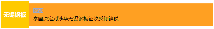 2023年10月25日,泰国倾销和补贴审查委员会发布公告称,决定重新实施对原产于中国、韩国和欧盟的无锡钢板(泰语:สินค้าเหล็กแผ่นชุบหรือเคลือบด้วยโครเมียมทั้งชนิดเป็นม้วนและไม่เป็นม้วน,英语:Tin Free Steel)的反倾销措施,基于到岸价(CIF)征收反倾销税,税率分别为中国4.53%~24.73%、韩国3.95%~17.06%、欧盟18.52%(详细税率请参阅本案终裁公告)。该措施自2023年11月13日起生效。