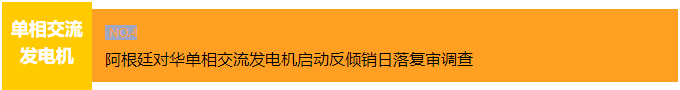 2023年12月6日,阿根廷经济部发布2023年第1694号公告,应阿根廷企业MOTORES CZERWENY S.A.申请,对原产自中国的单相交流发电机(西语:motores eléctricos de corriente alterna, asincrónicos, monofásicos, de potencia nominal superior o igual a CERO COMA DOCE KILOVATIOS (0,12 kW) pero inferior o igual a TRES KILOVATIOS (3 kW), y de peso superior o igual a CUATRO KILOGRAMOS (4 kg) pero inferior a CUARENTA Y CINCO KILOGRAMOS (45 kg) excluidos los motores monofásicos con mecanismos de freno y embrague integrados tipo “clutch motor” y los motores para lavarropas)启动第二次反倾销日落复审调查,案件调查期间,现行反倾销税持续有效。涉案产品为额定功率为0.12千瓦(含)~3千瓦(含)、重量为4千克(含)~45千克(含)的异步单项交流发电机,但不包括带集成离合器和制动机件的单相电机以及洗衣机电机,涉案产品的南共市海关编码为8501.40.19。公告自发布之日起生效。