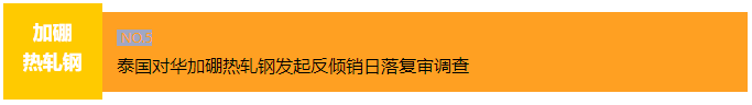 2023年12月6日,泰国倾销和补贴审查委员会发布公告称,对原产于中国的加硼热轧钢(泰语:เหล็กแผ่นรีดร้อนเจือโบรอนชนิดเป็นม้วนและไม่เป็นม้วน,参考英语:Flat Hot Rolled Steel added Boron in Coils and notin Coils)发起第二次反倾销日落复审调查。涉案产品为硼含量0.0008%以上,厚度为0.9~50.0毫米,宽度为100~3048毫米的热轧钢,涉及泰国海关编码7225.30.90.022、7225.30.90.023、7225.30.90.024、7225.30.90.032、7225.30.90.090、7225.40.90.024、7225.40.90.090、7226.91.10.022、7226.91.10.023、7226.91.10.024、7226.91.10.032、7226.91.10.090、7226.91.90.022、7226.91.90.023、7226.91.90.024、7226.91.90.032和7226.91.90.090。