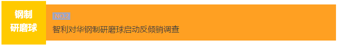 2023年12月9日,智利国家进口商品价格扭曲调查委员会在官方公报发布公告称,应智利企业Moly Cop申请,对原产于中国的直径小于4英寸的钢制研磨球(西班牙语:Bolas de acero forjadas para molienda convencional de diámetro inferior a 4 pulgadas)启动反倾销调查,涉案产品的智利税号为7326.1111。公告自发布之日起生效。